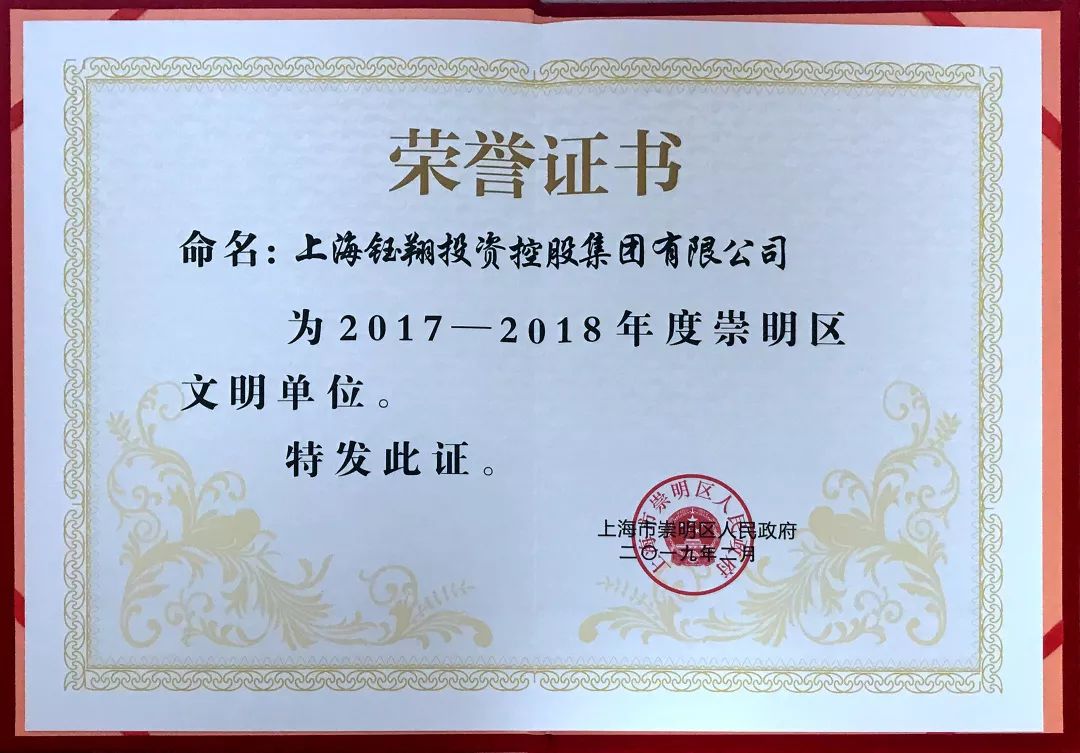 近日,鈺翔控股集團(tuán)再次被評為上海市崇明區(qū)文明單位,截至目前,鈺翔控股集團(tuán)已經(jīng)連續(xù)榮獲第十七屆(2013—2014年度)、第十八屆(2015—2016年度)上海市文明單位榮譽(yù)稱號,目前正在積極參評第十九屆(2017—2018年度)上海市文明單位。