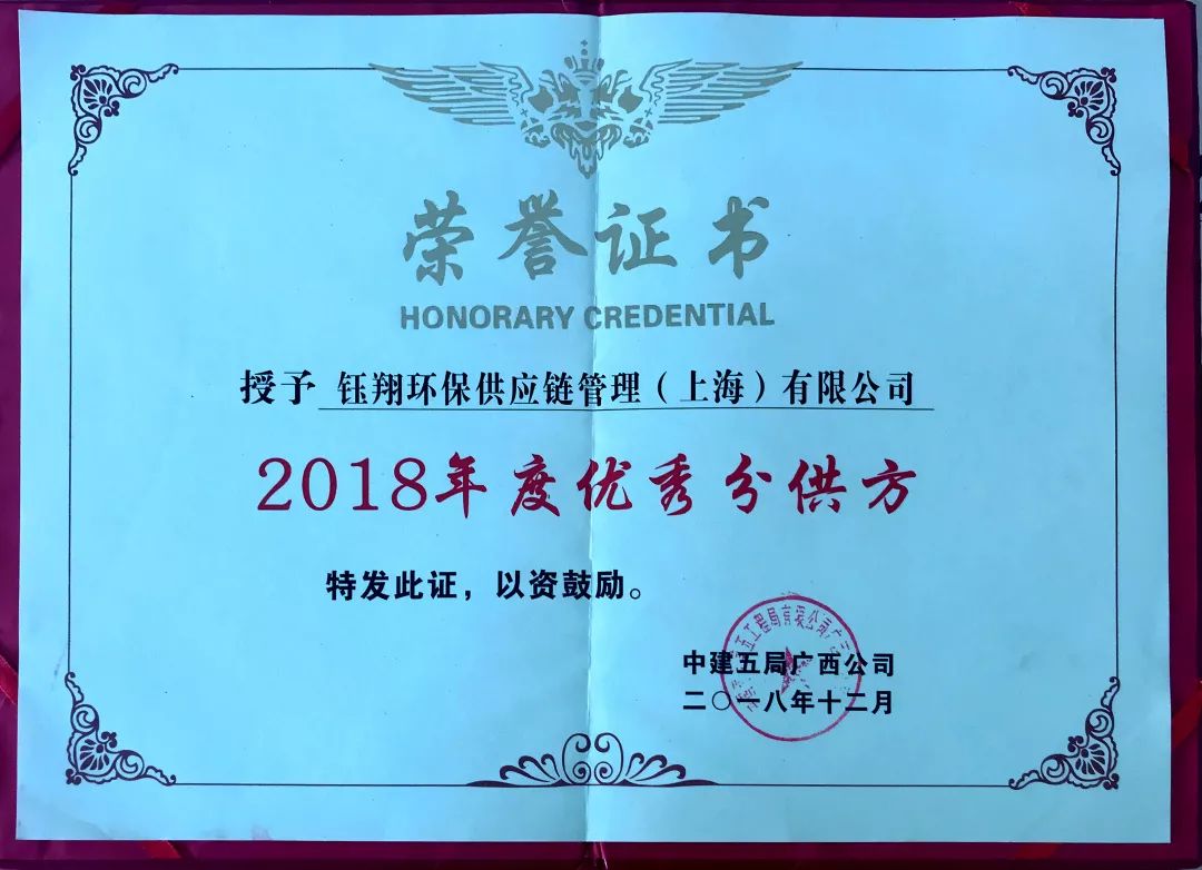 鈺翔環(huán)保供應(yīng)鏈管理(上海)有限公司被中建五局廣西公司評(píng)為優(yōu)秀分供方