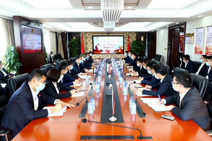 座談會在全場合唱中國共青團(tuán)團(tuán)歌的嘹亮歌聲中拉開帷幕。