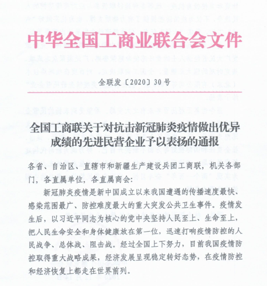 為大力弘揚(yáng)在抗擊新冠肺炎疫情中形成奉獻(xiàn)大愛(ài)精神,充分激發(fā)廣大民營(yíng)經(jīng)濟(jì)人士的責(zé)任感、使命感、榮譽(yù)感,日前,全國(guó)工商聯(lián)決定對(duì)1000家“抗擊新冠肺炎疫情先進(jìn)民營(yíng)企業(yè)”給予表?yè)P(yáng),鈺翔集團(tuán)喜獲全國(guó)工商聯(lián)表彰。