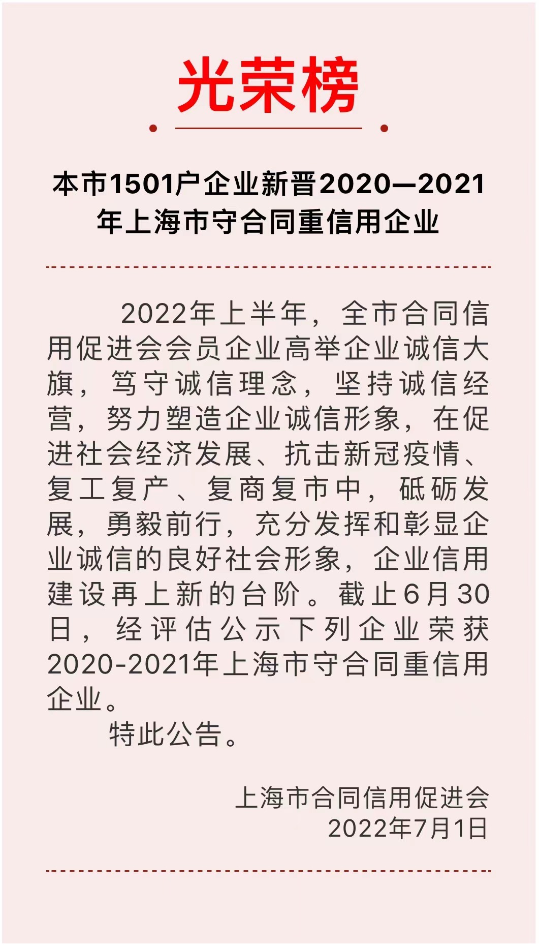 7月1日,上海市合同信用促進會公示了“上海市1501戶企業(yè)新晉2020-2021年上海市守合同重信用企業(yè)”光榮榜。